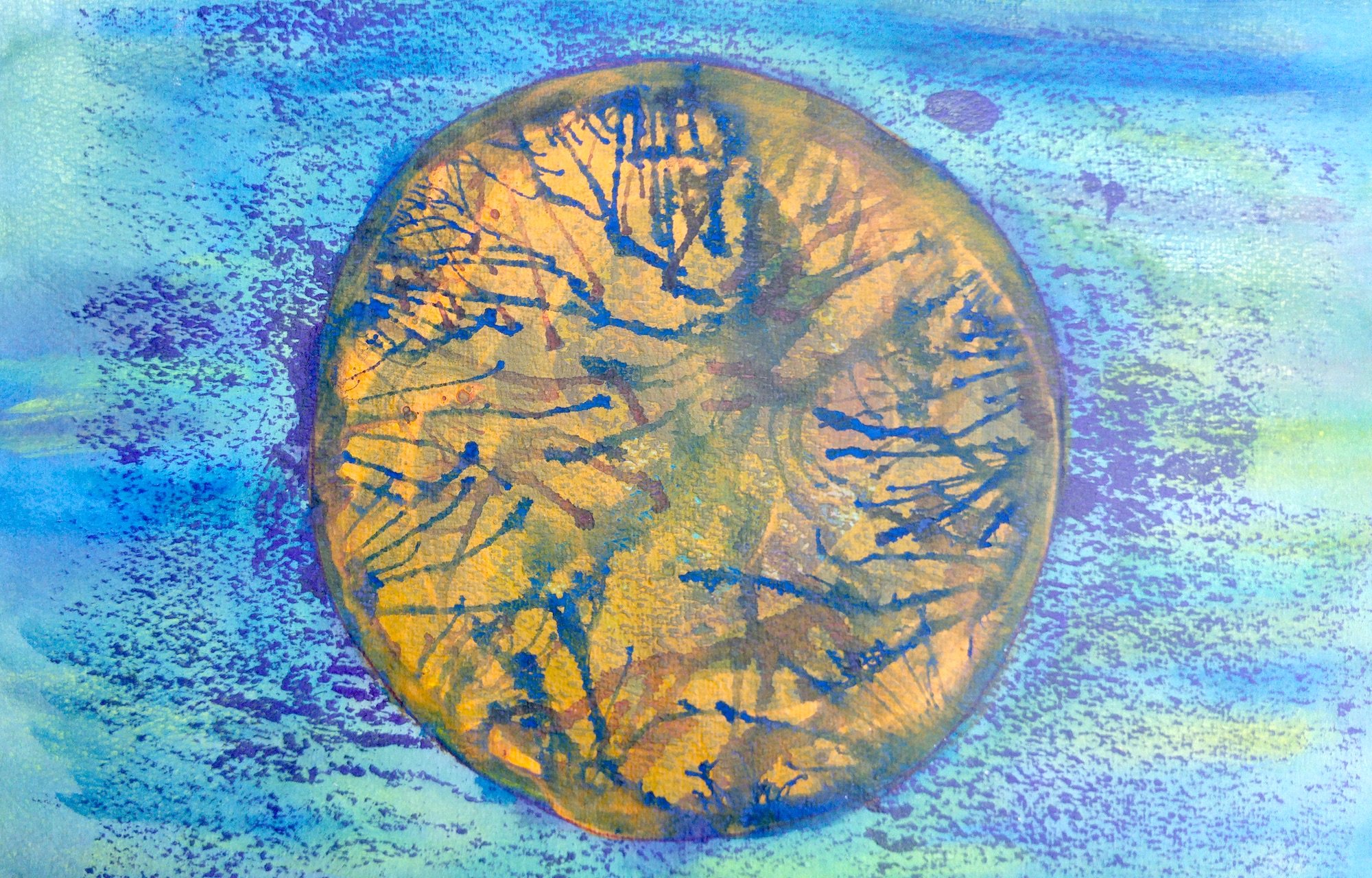 A dreamcatcher engulfing an orange moon. Part of my experimental watercolour series, inspired by the movement of wet paint.