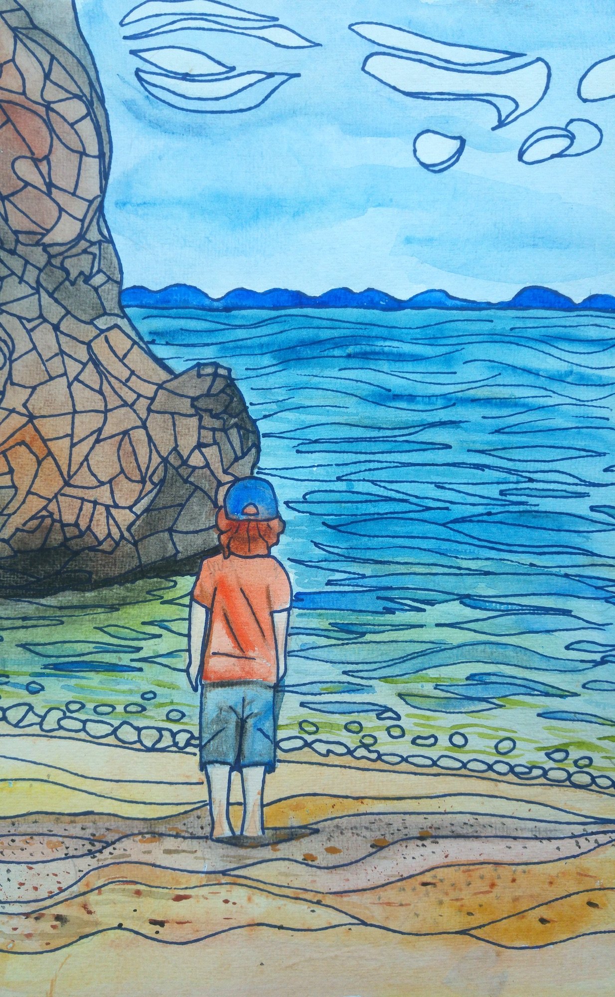 A painting of my son on holiday in a stained glass window style. This piece is an exploration of a more graphic style to give a stained glass effect.