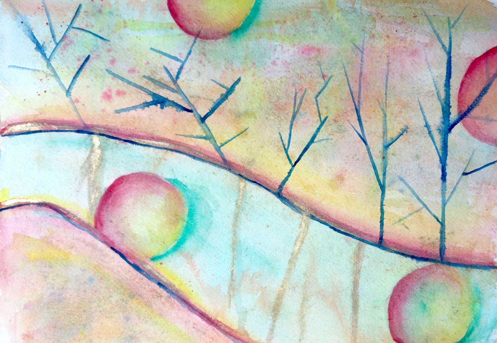 Two moons reflecting on a river, part of my experimental watercolour series, inspired by the movement of wet paint.